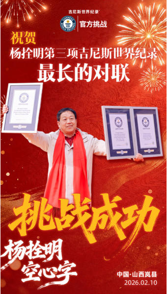 它创新探索了传统文化与现代语境的对话机制。通过吉尼斯世界纪录这一全球公认的认证体系,中国书法、楹联文化、小年习俗获得了国际通行的表达方式,实现了中华文化价值内涵的跨文化有效传播。这体现了我们在文化领域既坚守本源又开放包容的从容姿态,是“不忘本来、吸收外来、面向未来”的生动实践。