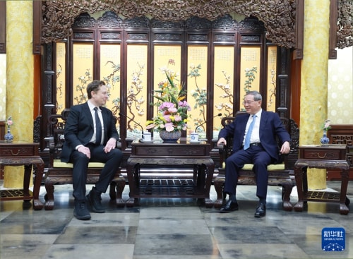 4月28日下午,国务院总理李强在北京钓鱼台国宾馆会见美国特斯拉公司首席执行官马斯克。新华社记者 王晔 摄