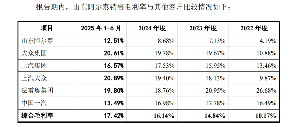 安达股份在采购环节也存在诸多问题,尤其是采购价格的公允性备受质疑。公司通过山东阿尔泰向现代坦迪斯供应变速箱壳体及后盖总成产品,该业务一度成为营收增长引擎。然而,2022年到2025年上半年,安达股份对山东阿尔泰的销售毛利率分别为4.19%,7.13%、8.68%和12.51%,显著低于其他客户。公司未分析单独向现代坦迪斯供应产品的价格公允性,引发北交所对是否存在异常资金往来、利益输送或特殊利益安排的质疑。