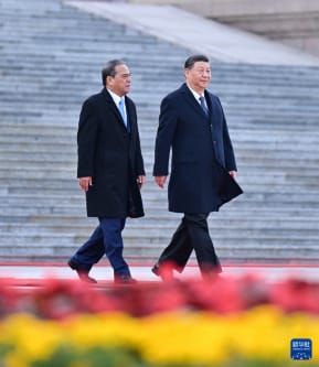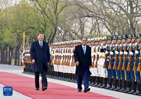 4月9日下午,国家主席习近平在北京人民大会堂同来华进行国事访问的密克罗尼西亚联邦总统西米纳举行会谈。这是会谈前,习近平在人民大会堂东门外广场为西米纳举行欢迎仪式。