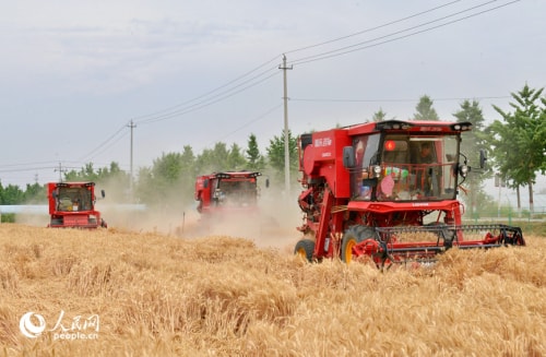 人民网漯河5月31日电(王玉兴、程明辉)农机轰鸣,金麦飘香。近日,在河南漯河市贾湖遗址附近的5000亩高标准农田内,4台收割机在麦田里来回穿梭。一垄垄成熟的小麦被卷进机器,收割、脱粒、秸秆粉碎一气呵成。