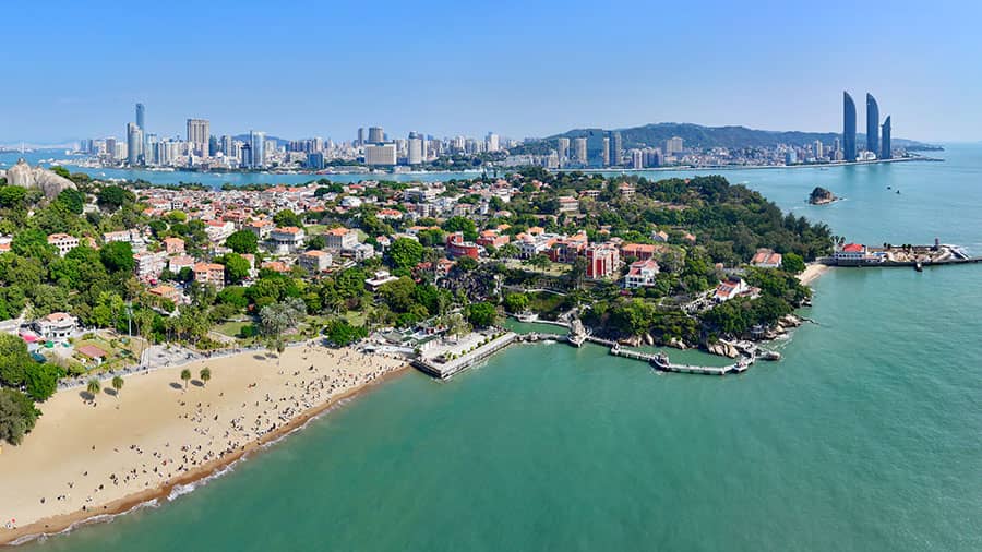 游人在厦门鼓浪屿沙滩上游玩(无人机照片)。新华社记者 姜克红 摄