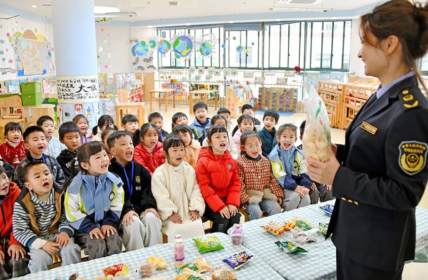 3月14日,在浙江省台州市仙居县中心幼儿园,市场监督管理局工作人员为孩子们讲解食品安全等方面知识。
