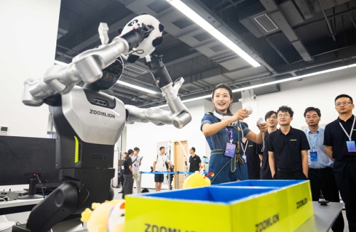 9月15日,在湖南湘江新区长沙智谷,观众操作人形机器人进行娃娃抓取。