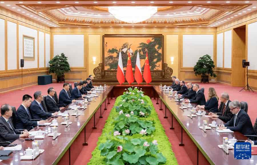 习近平指出,波兰是最早承认新中国的国家之一,今年是中波建交75周年。75年来,中波关系始终保持平稳发展。特别是8年前我们共同决定将中波关系提升为全面战略伙伴关系以来,两国各领域交流合作全面拓展深化,合作成果惠及两国人民。当前,世界之变、时代之变、历史之变正以前所未有的方式展开。中方愿同波方一道,坚持和平共处五项原则,秉持建交初心,赓续传统友好,推动两国关系持续向更高水平发展,为变乱交织的世界注入更多稳定性和确定性。