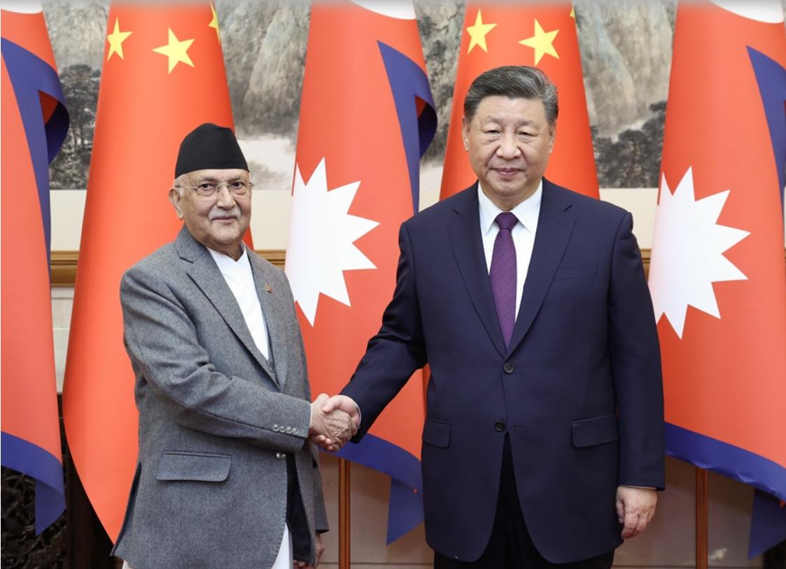 习近平赞赏奥利长期坚定致力于中尼友好事业,指出中国和尼泊尔是山水相连的好邻居、好朋友、好伙伴,两国始终真诚相待、相互尊重、相互支持,双边关系保持健康稳定发展。明年是中尼建交70周年。中方把中尼关系置于周边外交的重要位置,愿同尼方秉持建交初心,巩固传统友谊,推动中尼面向发展与繁荣的世代友好的战略合作伙伴关系取得新的更大发展。