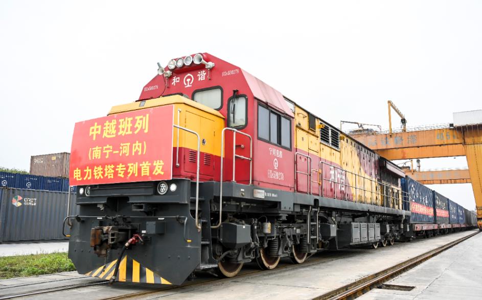 2024年3月8日,在广西南宁国际铁路港,电力铁塔专列准备发车。当日,一列满载340吨电力铁塔的中越班列从南宁国际铁路港开出,发往越南河内。新华社记者 曹祎铭 摄